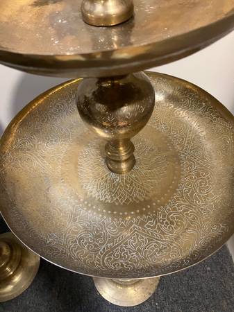 Pair of Large Vintage Brass Floor Candle Holders, Possibly Moroccan, Adorned w/ Etched Scrolled Designs Throughout. Good overall condition 47 inches tall 15 pounds each. 859-893-310five. $75.00